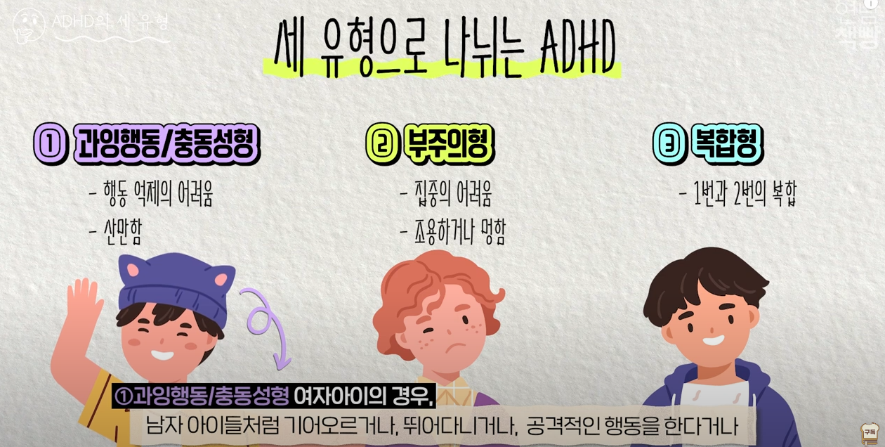 ADHD는 크게 주의력 결핍형, 과잉행동-충동형, 혼합형으로 나눌 수 있다.